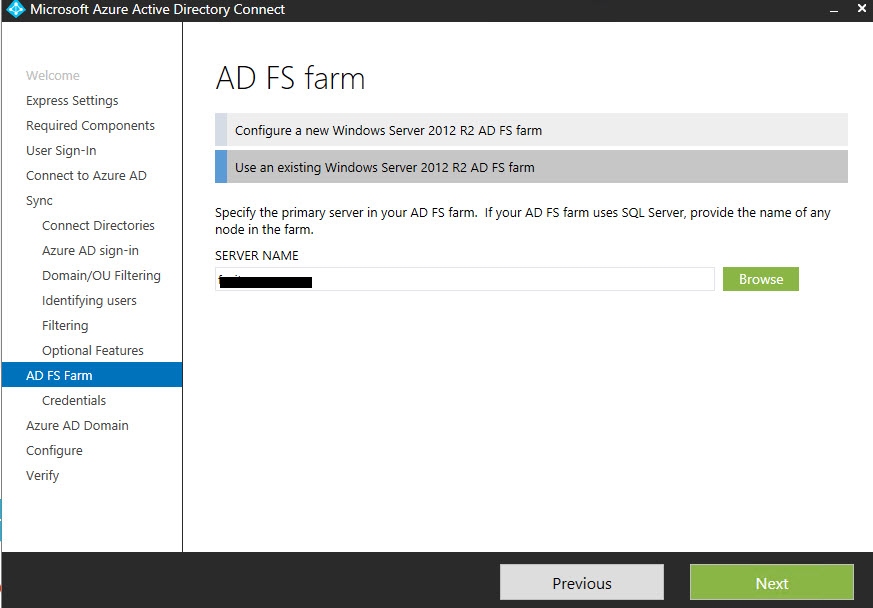 Step 11: Hook Azure AD Connect into existing AD FS farm. I specified the local server name rather than the published service name.