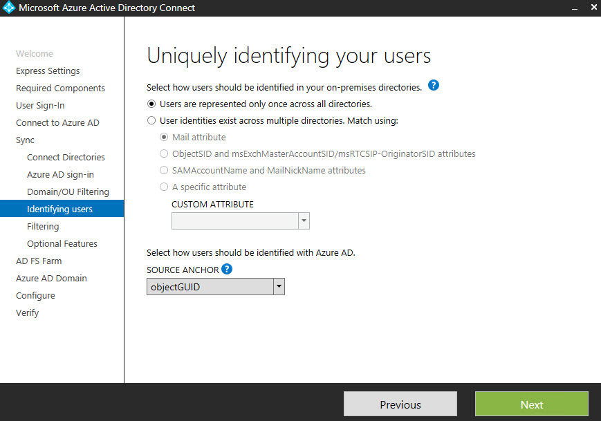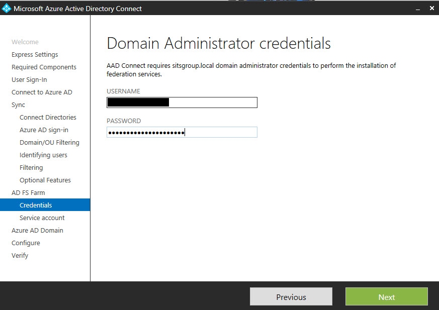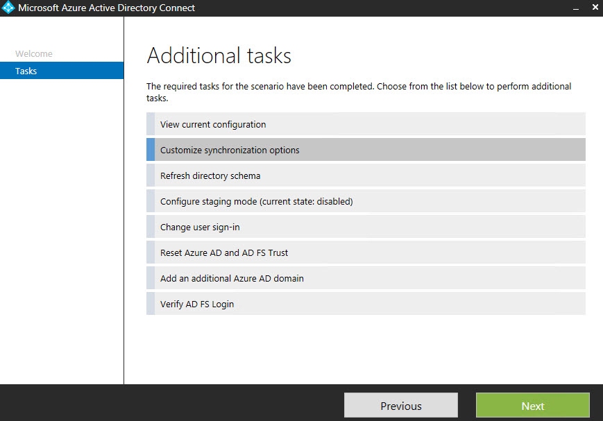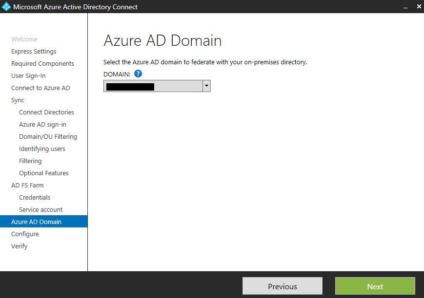 Below are the steps I took to configure Azure AD Connect to hook into our corporate Office 365 environment. This guide assume you already have ADFS configured in your environment. There is an excellent blog post on how to configure this here – http://nolabnoparty.com/en/adfs-3-0-setup-upn-suffix-for-office-365-sso-pt-1/