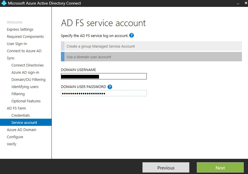 Step 12: Specify account used to hook into ADFS. You should already have a ADFS service account that can be used for this purpose