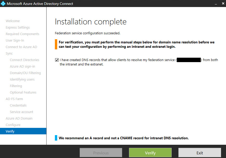 Step 16: Once installation is complete Azure AD Connect needs to verify that the ADFS environment is available from inside and outside the corporate network. Click verify